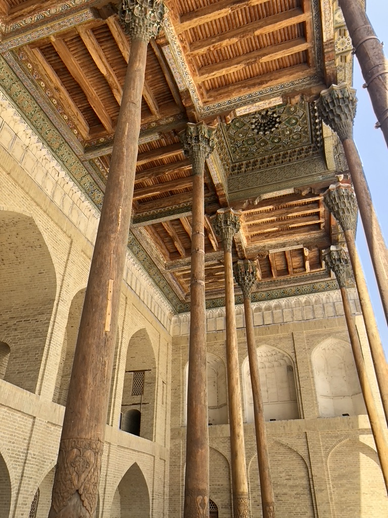 Once I had left the prison museum, I met Sabrina again for Part 2 of our impromptu English lesson, this time to collect her 5 year old sister from school. The 20 minute walk took us through some of the suburban areas of the newer part of Bukhara, which is very Soviet in design, including large concrete buildings, and wide, tree-lined boulevards. Sabrina’s sister was very excited to meet me, and whilst it was certainly a challenge to understand a 5 year old speaking Tajik, I realised that she was calling me a ‘funny white ghost’! I left Sabrina and her sister at the top of their street, then walked back west to explore in greater detail the wooden pillars of the Bolo-Hauz mosque, before heading back to my accommodation.