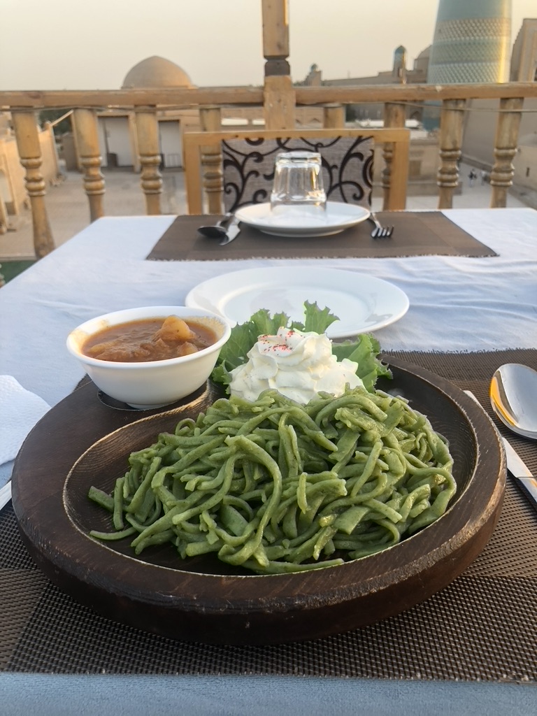 We stopped off for a short visit at two other fortresses before we found ourselves driving through Urgench on the road to Khiva. Finally, Nazrullo pulled through one of the back entrances to Itchen Kala, and dropped me off at the front of my accommodation for the next three nights, Meros B&B. Here, I met Jaloladdin, the owner, and his extended family that lived in the house. My room was upstairs, which meant that when I opened the blinds, I had a fantastic view over Khiva. It was getting late, and I was hoping to catch sunset from a rooftop somewhere, so I headed to Terrassa Cafe, a rooftop restaurant within the city walls, where I got to watch the sunset whilst eating shivit oshi, a Khivan specialty green noodle dish (incredibly tasty!).