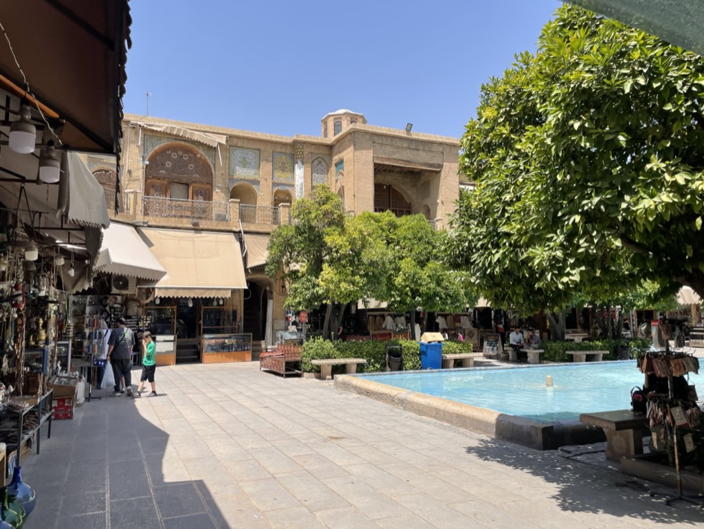 After a decent night’s sleep in Arg Hotel’s incredibly hard mattresses (great for supporting your back!), and a quick breakfast at the hotel – tomato omelette for me, an Iranian lentil dish for Dad – and we were off to our first stop of the day, the Pink Mosque. Named for the incredible pink-coloured tiles on its inside walls, the Pink Mosque was full of what appeared to be Iranian tourists, taking quick pauses between taking photos to kneel and pray. The light in the mosque comes in through the absolutely beautiful stained glass windows, and very much accentuated the pink on the walls. Certainly worth the visit!
