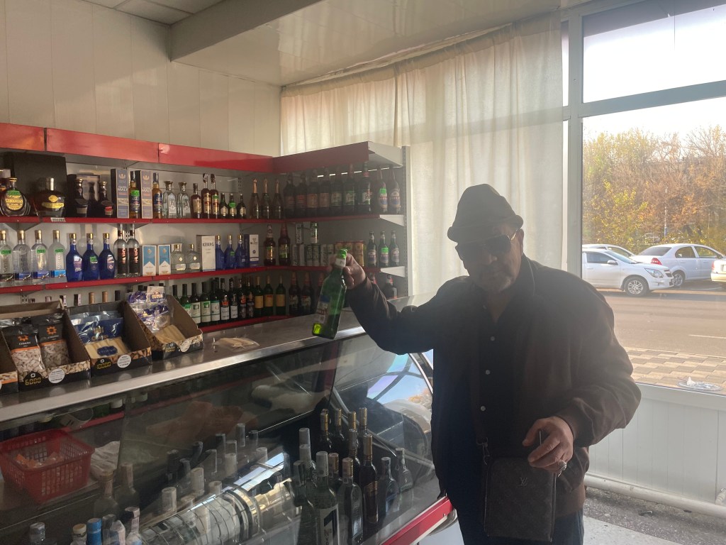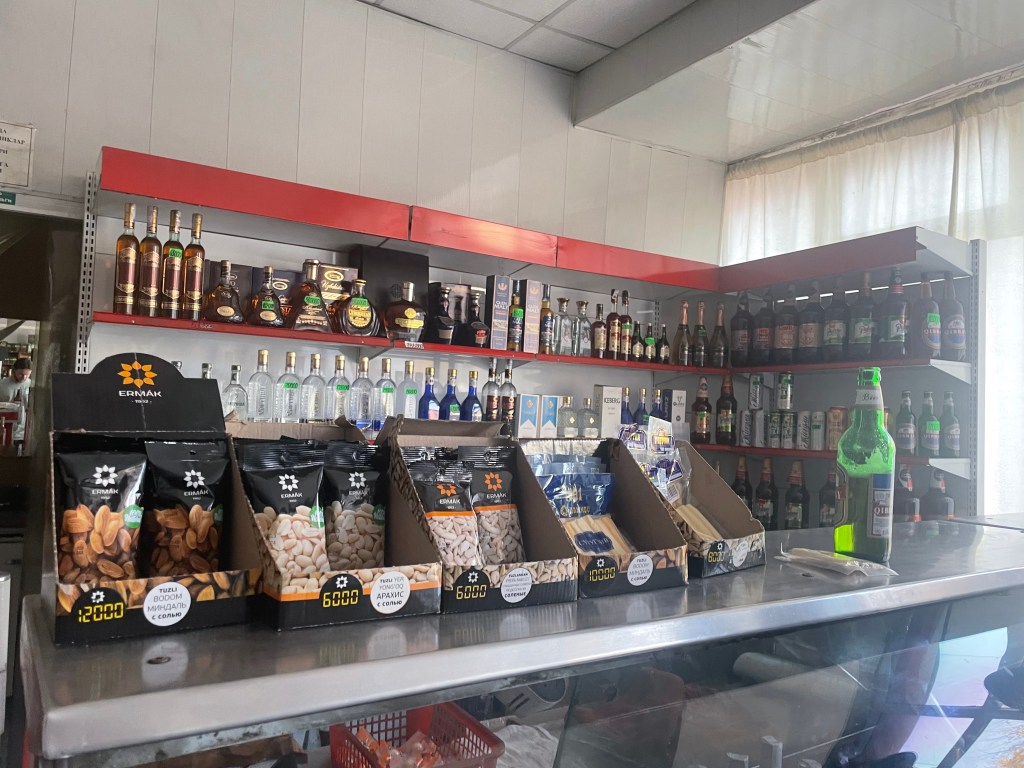 Once I had finished up there, I caught up with Mathilde, the NGO worker from the flight, at Roni Pizza (sometimes Western comfort food is necessary!). After lunch, we parted ways, and I headed towards the train station. Around the corner from the station, I popped into a convenience store, ostensibly to buy a Coke. Attached to the convenience store, however, was a liquor store (they’re still very Soviet-looking here!), with a few people inside. I stuck my head in and ended up drinking a beer with a few elderly Uzbeks who were drinking ‘shots’ of vodka – about 200mls per glass!