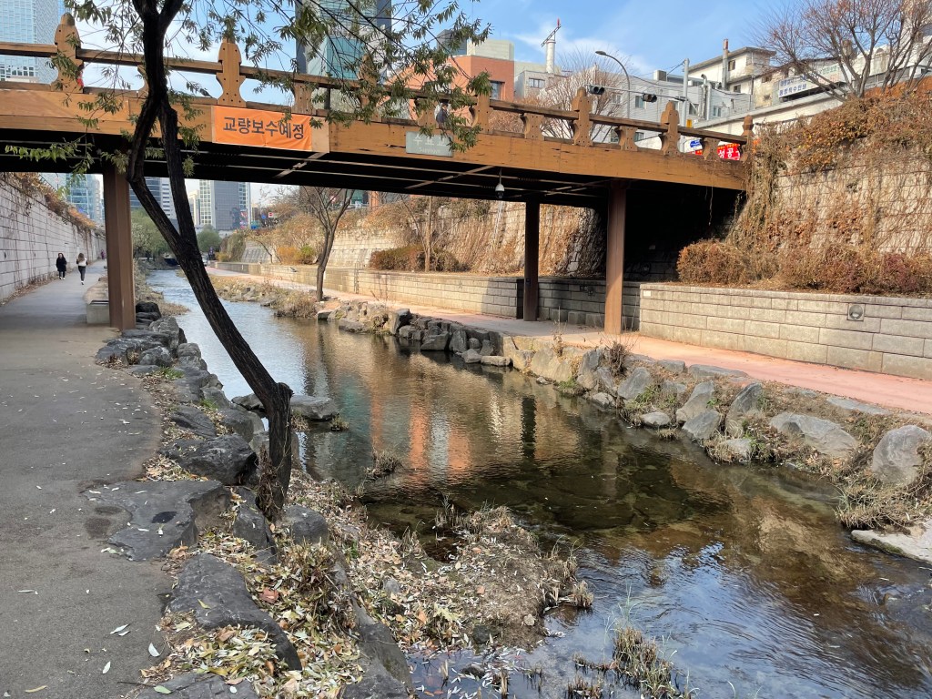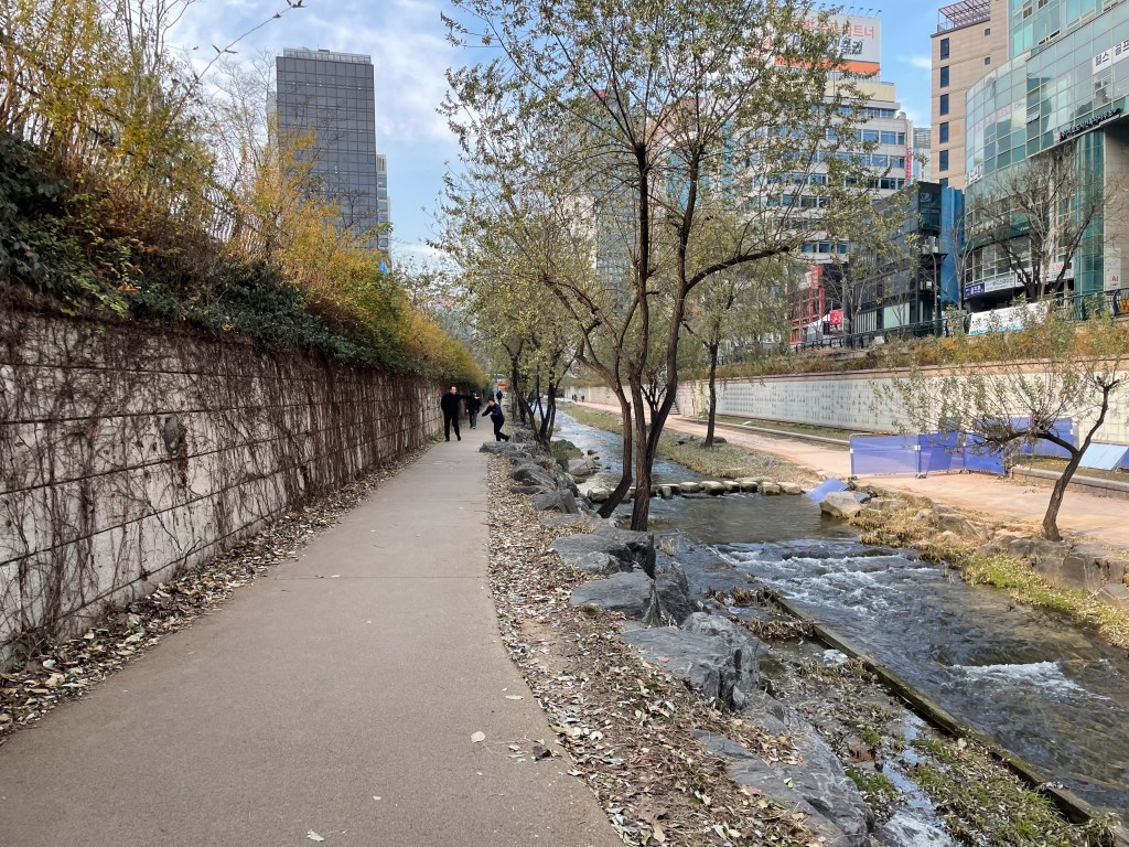 After acquiring breakfast, I headed back up to my room, packed my bags, and checked out at 10am on the dot (Toyoko Inn’s weirdly early checkout time). I left my bag in the hotel, and headed out into Seoul for a cruisy day of people-watching and street-walking. I headed out on the metro to a station by the western end of the Cheonggyecheon Stream, a very pretty 10km long river/stream in the middle of Seoul, which thanks to some urban renewal projects, is a beautiful oasis a few metres below the hustle and bustle of Seoul’s streets. I wanted to go for a run, but my lungs had been lacking considerably in capacity since the flu, and I decided to take it easy and walk my way along its length. It took me a while, but I had nothing but time today! When I reached the eastern end of the stream, I decided to head over to the nearby War Memorial for a quick look at the sculptures reminding Koreans of the conflict which, if I remember correctly, is technically not over.