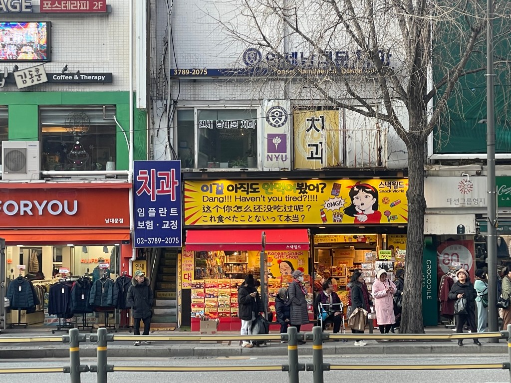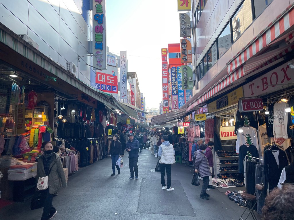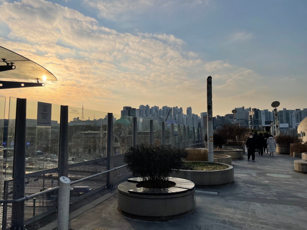After this, I headed out to the Namdaemum Markets, a lively trading area filled with stalls selling everything from shirts to camera parts to fish (I’m not kidding). Honestly, this place is an absolute maze, and if I was in a rush trying to get somewhere, it might have felt like a nightmare – but I had nowhere to be, and nothing in particular to do, and I very much enjoyed getting swept up in the rush of it! My final stop for the day, before acquiring food, was to walk back to Seoul Station, and cross over the busy highway on the elevated pedestrian platform. This is no ordinary walkway – it is lined with various species of trees and plants, trampolines, and offers amazing views of the Seoul cityscape – it reminded me very much of the New York City Highline! I walked the length of the bridge, and then calculated how long it would take to walk back to Yeoungdeungpo, where my bag was – 2 hours, according to NaverMap (remember, Google Maps doesn’t work properly in Korea!). I decided that given I was about to be cooped up on a plane for a while, another long walk would serve me well!