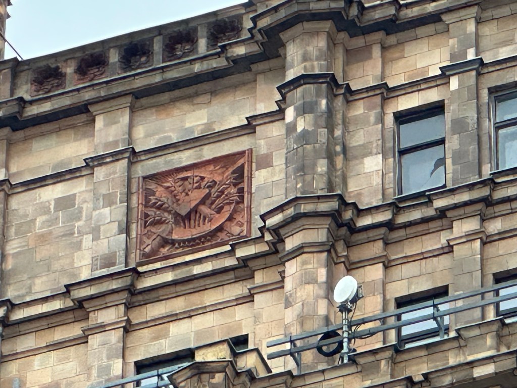A hammer and sickle spotted in the building’s facade, a view of the Central Markets (spot the Zepplin hangars, they’re hard to miss!), and some of Riga’s residential/light industrial districts