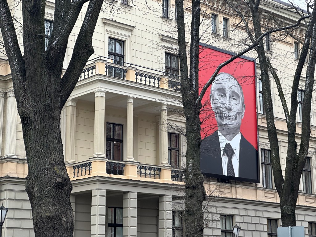 I was curious to find the Russian Embassy here in Riga – the building in Tallinn had been almost completely surrounded by protest posters, and I wanted to know if Riga’s was the same. Whilst there was less protest activity going on outside the embassy, the building next-door had put up an poster directly facing the Russian Embassy building.