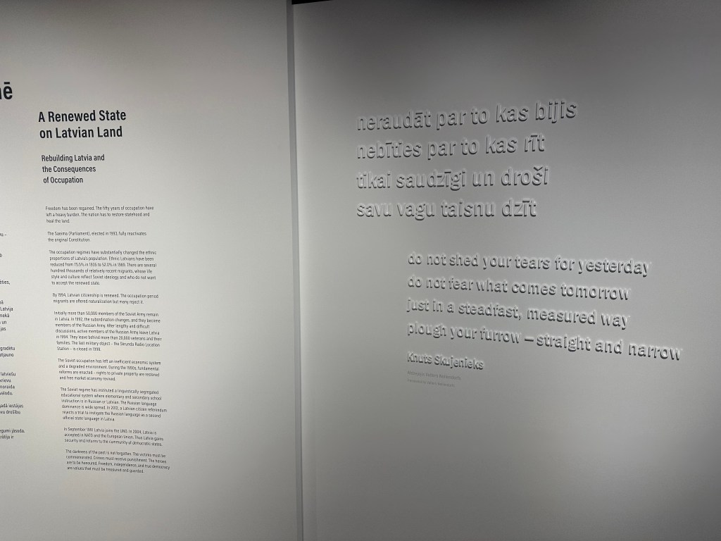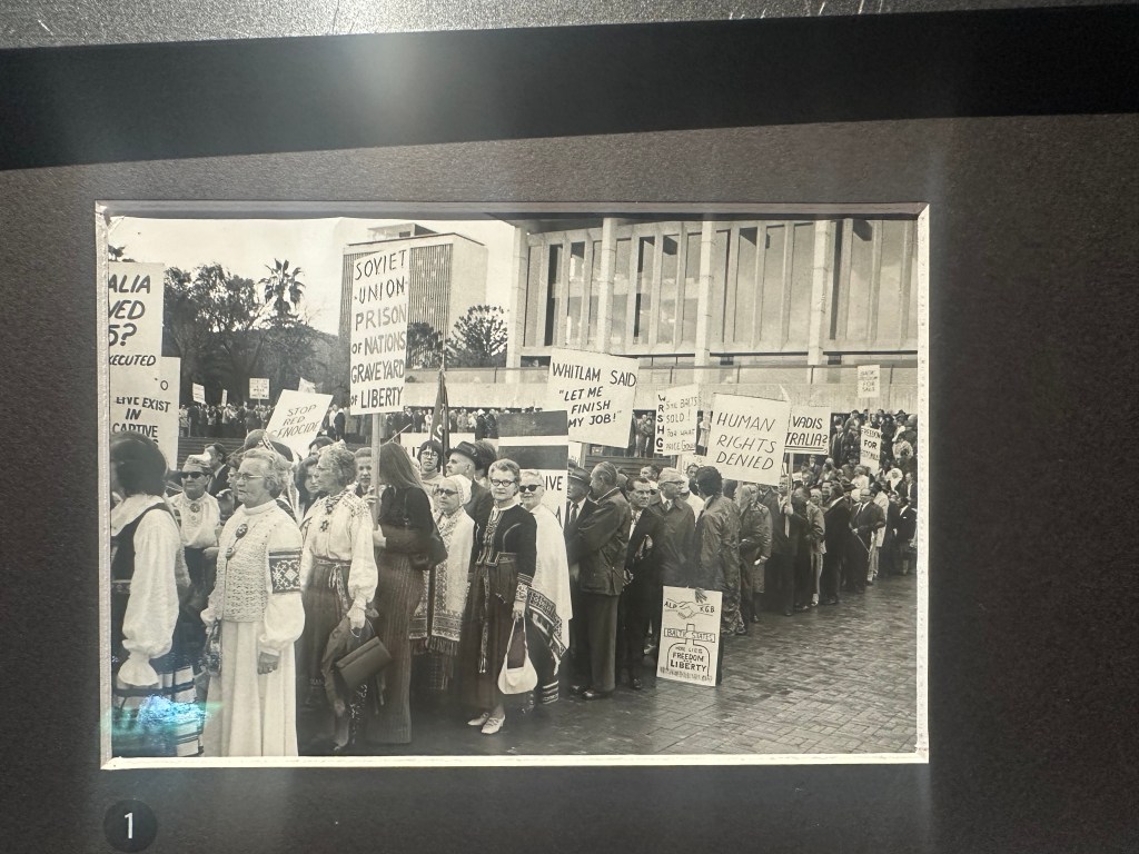 A photograph in the museum of a protest in Perth, in support of the Latvian people, and a quote from Knuts Skujenteks, a Latvian poet – the last exhibit in the museum