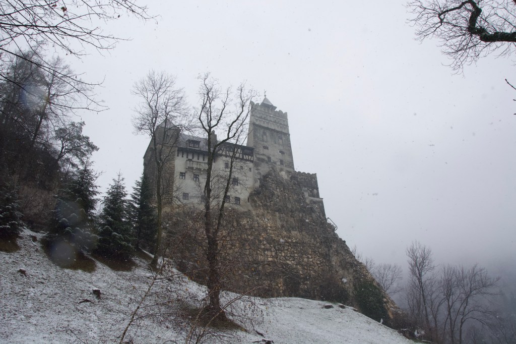 Bran is a bit higher up in the mountains than Brasov, and the rain which had begun coming down in the city that morning was coming down as snow in Bran – it made for some very picturesque images of the castle! We walked up the path to the entrance, then took a circuitous route around the back of the castle – amazingly, the crowd of people visiting were confined to the entrance and interior of the castle – the grounds were empty, and we had the run of the place!