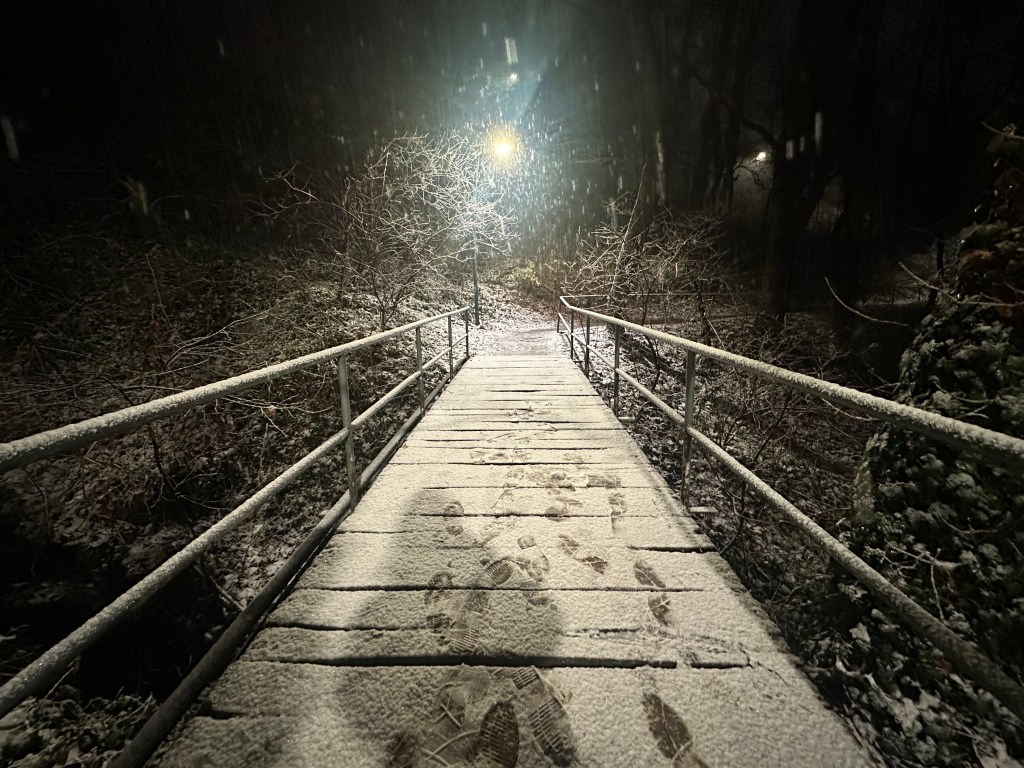 Outside, it had begun snowing, and when we walked out of the pub, we were greeted with a thin layer of white across the pavement. We decided to take a walk back up to the Black and White towers to get some views of the city in the snow – and despite the slippery steps nearly getting the better of me, it was absolutely worth it.