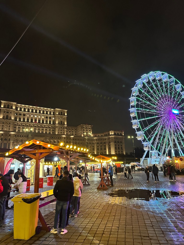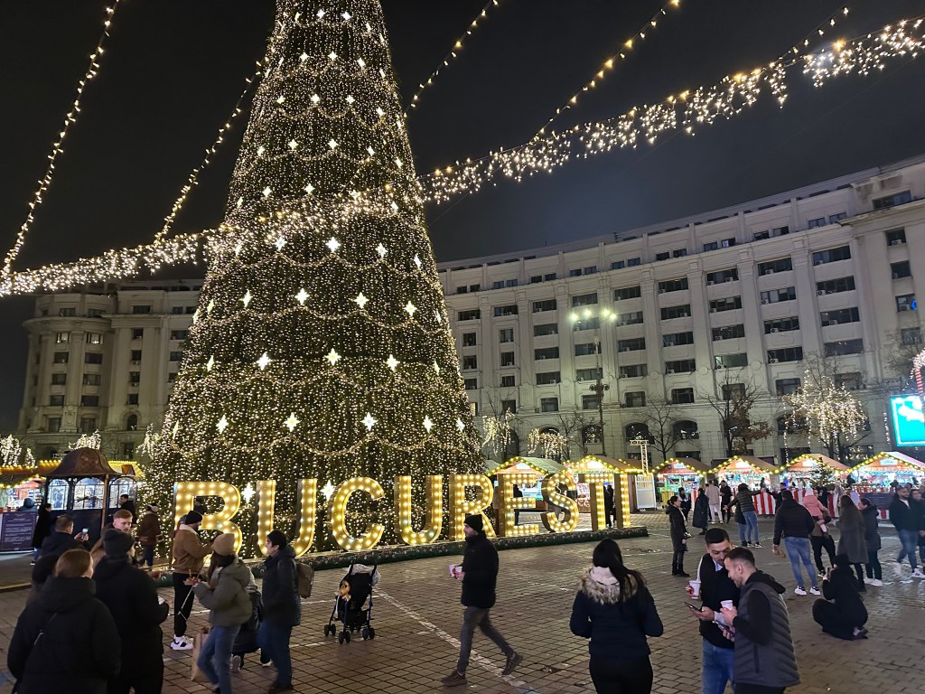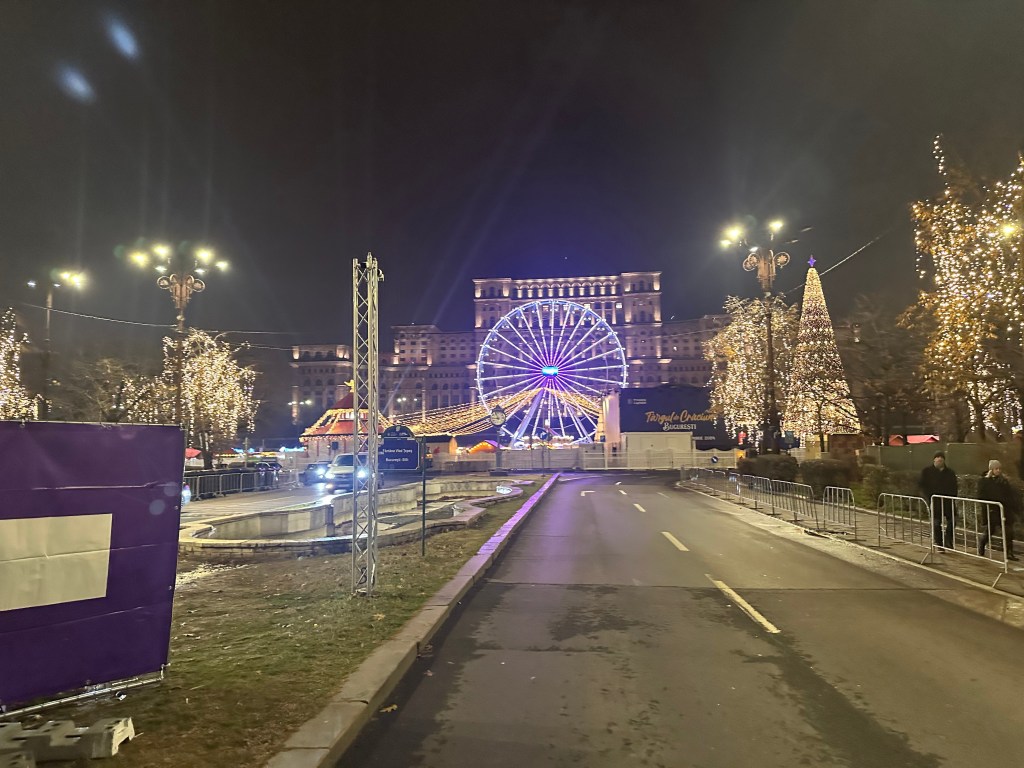 Bucharest is full of weird and wonderful buildings, but none are as imposing as the Palace of the Parliament. One of the largest buildings in the world, and apparently the heaviest, the sheer scale of the Palace is hard to grasp from photos alone. Construction began in 1984, and included the complete destruction of an entire residential neighbourhood, Uranus-Izvor – it was finally completed in 1997, a full 8 years after the fall of the Ceausescu regime. It is estimated, however, that around 70% of its roughly-1100 rooms still remain vacant. The square in front of the Palace was being used for a Christmas market – we made a mental note to return here that evening to check it out!