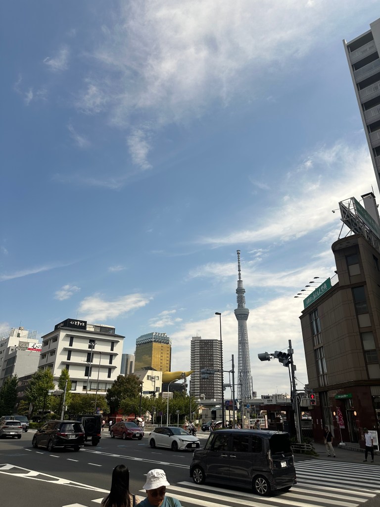 An intersection in Asakusa, with the Tokyo Skytree in the background